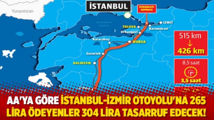 Anadolu Ajansı “Kısalan yol tasarrufu artıracak” başlıklı bir haber yayınladı. Anadolu Ajansı tarafından servis edilen haberde yeni açılan İstanbul-İzmir Otoyolu’nu kullanacak bir otomobilin tek yönde 304 lira tasarruf edeceği öne sürüldü.