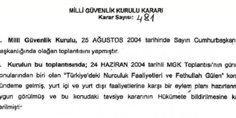 Ankara Başsavcı Vekili Necip Cem İşçimen’in yazdığı iddianamede, MGK’nın 25 Ağustos 2004 günü yaptığı toplantıda, “Fetullah Gülen grubunun faaliyetlerine karşı alınması gerekli tedbirler” başlığı altında, Nurculuk ve Fetullah Gülen grubuna ait kuruluşlarının faaliyetlerinin engellenmesi için 15 ayrı karar aldığına vurgu yapıldı.