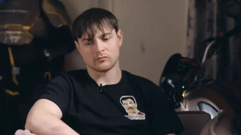 Eski Rus subayı Yevgeni Korobov, odanın ortasında rahat bir şekilde duruyor, siyah bir gömlek ve açık renk pantolon giyinmiş.