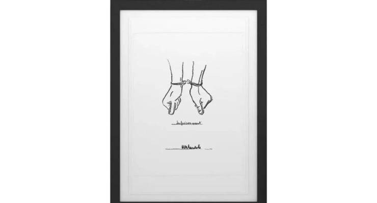 Eserde ‘Hapis’ kelimesi, kelepçelenmiş bir çift elle Mandela’nın imzası yer alıyor.