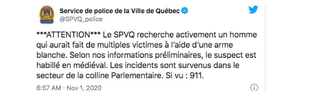 Quebec polisi, Meclis binası yakınında pek çok kişinin bıçakla yaralandığını açıkladı. Saldırganın ortaçağ kostümü giydiği bildirildi.