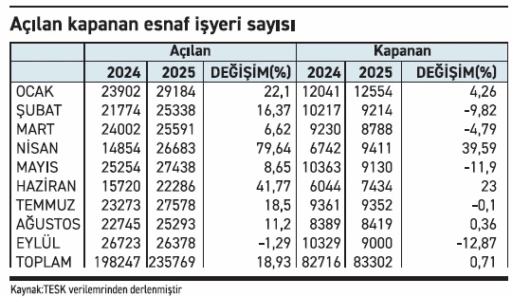 Ocak-Eylül döneminde ise açılan esnaf işyeri sayısı yüzde 18.9’luk artışla 235 bin 769’a çıkarken, kapanan işyeri sayısı neredeyse yerinde saydı ve yüzde 0.71’lik artışla 83 bin 302’ye yükseldi. 2024 yılının tamamında kurulan esnaf işyeri sayısı önceki yıla göre yüzde 8.33 azalarak 287 bin 624’e, kapanan işyeri sayısı da yüzde 13.7 azalarak 120 bin 5’e gerilemişti.