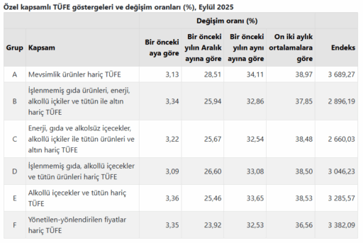 İşlenmemiş gıda ürünleri, enerji, alkollü içkiler ve tütün ile altın hariç TÜFE’deki değişim, 2025 yılı Eylül ayında bir önceki aya göre yüzde 3,34 artış, bir önceki yılın Aralık ayına göre yüzde 25,94 artış, bir önceki yılın aynı ayına göre yüzde 32,86 artış ve on iki aylık ortalamalara göre yüzde 37,85 artış olarak gerçekleşti.