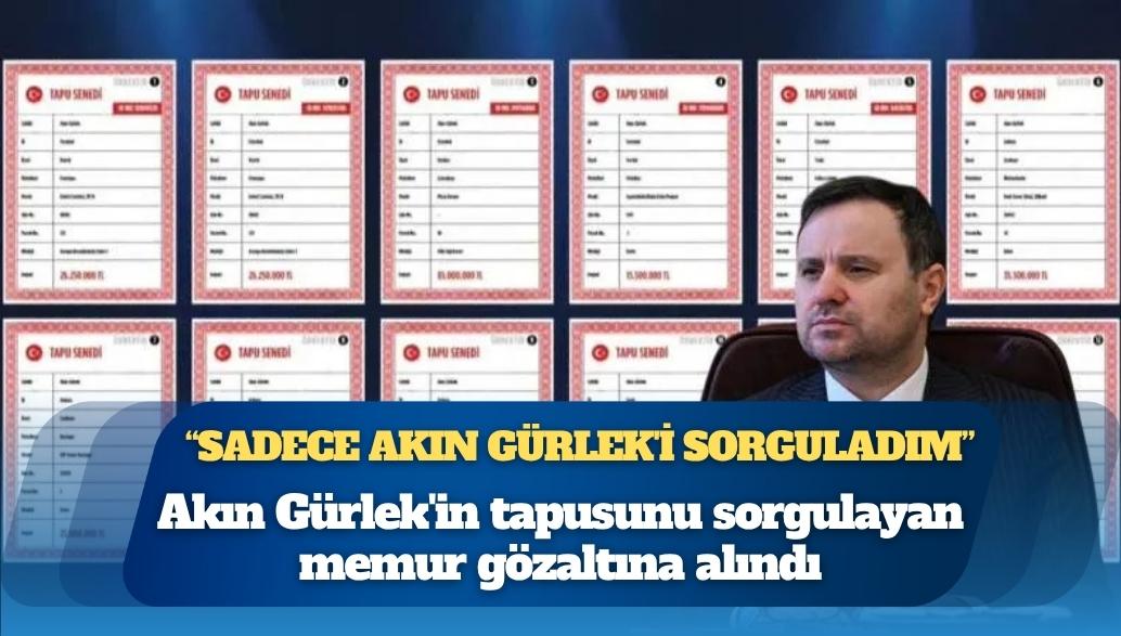 Akın Gürlek’e ait tapuların farklı tapu müdürlüklerinde sorgulandığının tespit edilmesinin ardından 3 tapu görevlisi açığa alındı. Kaş Tapu Müdürlüğü’nde görevli memur Diyar A. ise gözaltına alındı.