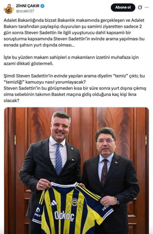 “Adalet Bakanlığında bizzat Bakanlık makamında gerçekleşen ve Adalet Bakanı tarafından paylaşılıp duyurulan şu samimi ziyaretten sadece 2 gün sonra Steven Sadettin ile ilgili uyuşturucu dahil kapsamlı bir soruşturma kapsamında Steven Sadettin’in evinde arama yapılması bu esnada şahsın yurt dışında olması…