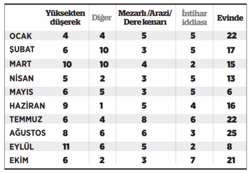 Yılın ilk 10 ayında en az 375 kadın şüpheli olarak yaşamını yitirdi. BirGün’ün hazırladığı verilere göre, 2025 yılının Ocak-Ekim döneminde 71 kadın ispatlanması en zor ölümlerden olan ‘yüksekten düşmeye’ bağlı olarak hayatını kaybetti. Mezarlık, arazi, dere kenarı gibi yerlerde en az 45 kadın ölü bulundu. 44 kadın ise intihar süsü verilmiş şekilde hayatını kaybederken, 50 kadın ise silahla ya da yangında öldüğü iddiasıyla kayıtlara geçti. En az 165 kadın ise evinde, işyerinde ya da bir otel odasında ölü olarak bulundu.