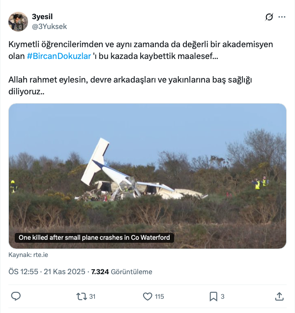 KHK’lı pilot Bircan Dokuzlar, İrlanda’nın Waterfoord bölgesinde geçirdiği uçak kazasında hayatını kaybetti. Aynı zamanda akademisyen olan ve “Yeni Silah Doğalgaz” (IQ Kültür Sanat Yayıncılık, 2006) adlı bir kitabı bulunan Dokuzlar, 48 yaşındaydı.