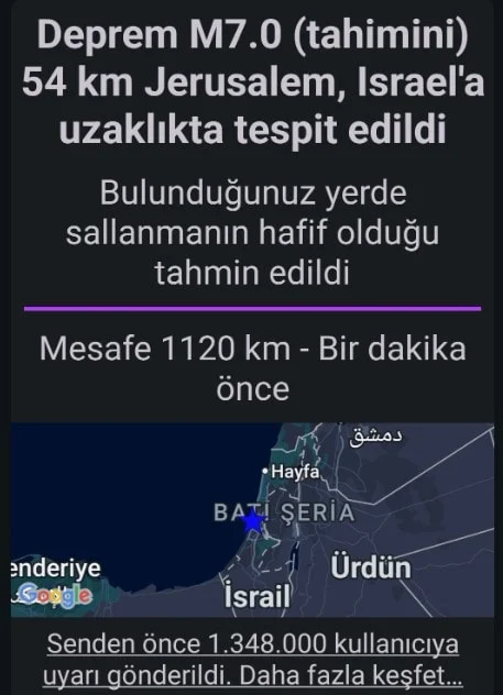 Sabah 6 sularında Türkiye’deki ve komşu Yunanistan’daki telefonlara İsrail’in göbeğindeki bir sarsıntı olduğuna dair bildirim yağdı. Bazı telefonlardaki uygulamaların alarmı devreye girerken birçok kişi güne alarmlarla başladı.