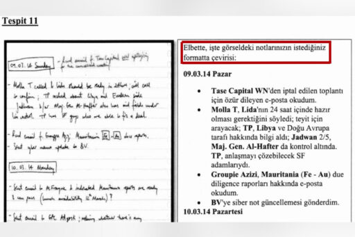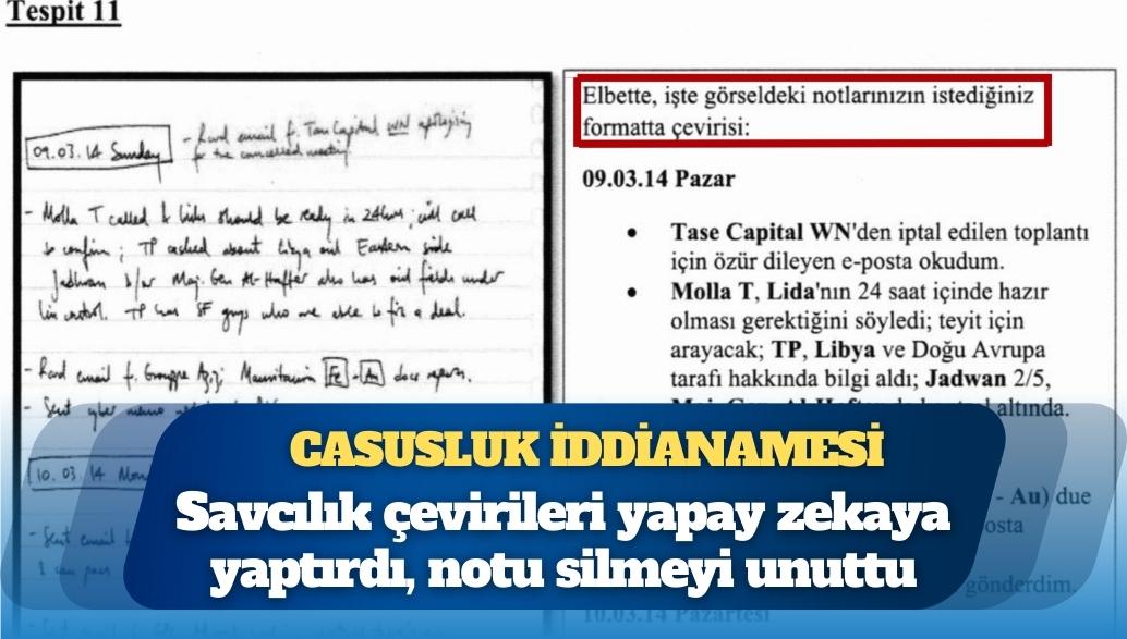 Sol Haber’den Yiğit Günay’ın haberine göre; iddianamede yer alan “Tespit 11” adlı ara başlığın altında yer alan kısımda yapay zekanın “Elbette işte görseldeki notlarınızın istediğiniz formatta çevirisi” şeklinde yanıtlayıp çeviriyi yaptığı görülüyor.