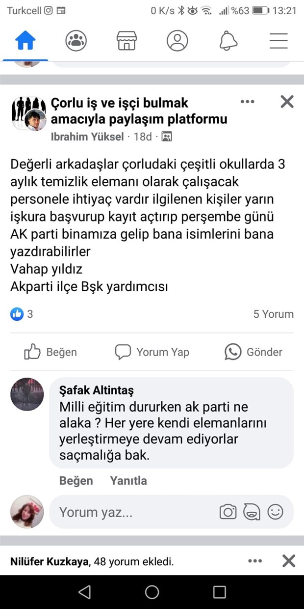 Söz konusu ilanı Facebook iş bulma grubunda paylaşan Yüksel, “Değerli arkadaşlar, Çorlu’daki çeşitli okullarda 3 aylık temizlik elemanı olarak çalışacak personele ihtiyaç vardır. İlgilenen arkadaşlar yarın İŞKUR’a başvurup, kayıt açtırıp Ak Parti binamıza gelip bana isimlerini yazdırabilirler. Vahap Yıldız – Ak Parti İlçe Başkanı” ifadelerini kullandı.