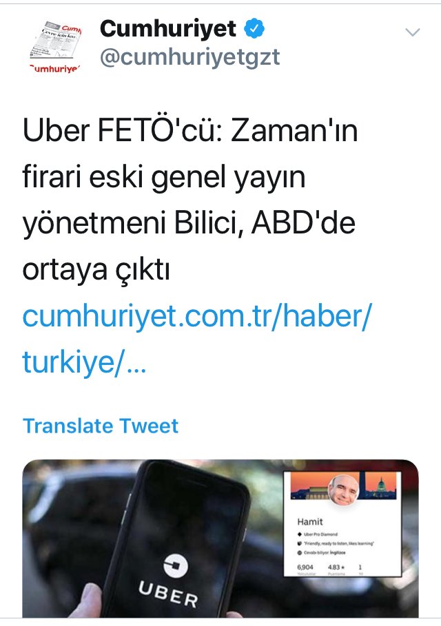 Habere göre; Akşam Gazetesi Washington Temsilcisi Yavuz Atalay, Uber’den kendisine yakın bölgedeki en yüksek puanlı Uber taksiyi seçerek çağırdı. Bölgedeki en yüksek puanlı Uber sürücüsü Abdülhamit Bilici’ydi.