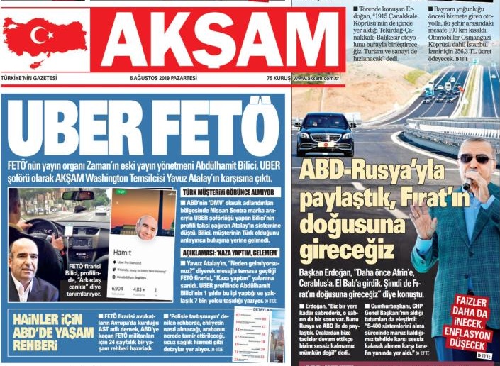 Bugün ise Akşam Gazetesi’nde bu propagandanın tam tersi bir haber çıktı. Zaman Gazetesi’nin son yayın yönetmeni Abdülhamit Bilici’nin Amerika’da Uber taksi şöförlüğü yaptığı Akşam Gazetesi’ne manşet oldu.