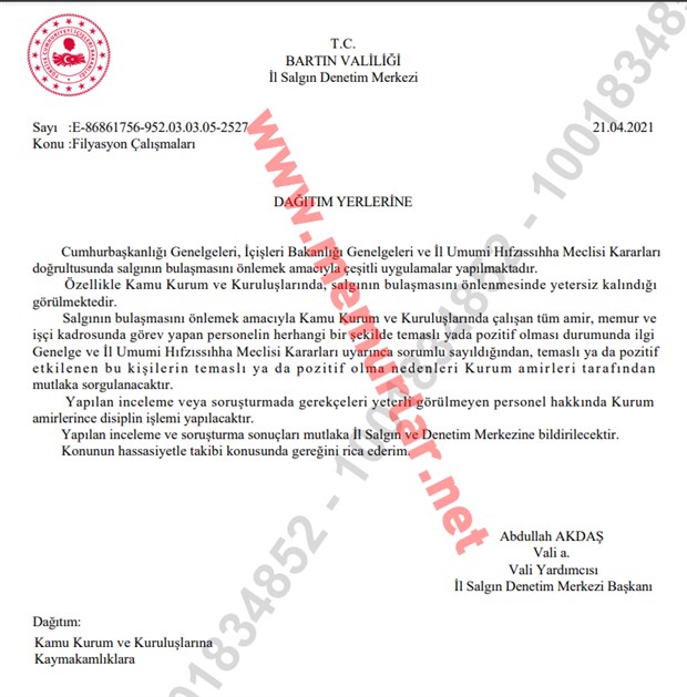 Bartın Valiliği, ilgili birimlere gönderdiği yazıda temaslı veya pozitif olan memur ve işçilerin durumlarının sorgulanmasını, yapılan incelemede gerekçeleri yeterli görülmeyen personele disiplin işlemi yapılmasını istedi.