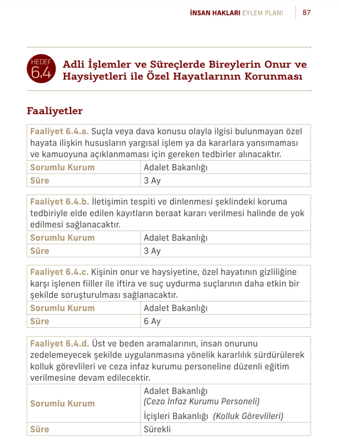 Eylem Planında, HDP’li Ömer Faruk Gergerlioğlu’nun Uşak’taki kadın öğrencilerin maruz kaldığını Meclis’te gündeme getirmesiyle ortaya çıkan ve çok sayıda mağdurun bulunduğu çıplak aramanın önlenmesiyle ilgili hedefler bulunması dikkat çekti. Eylem Planında, “Adli İşlemler ve Süreçlerde Bireylerin Onur ve Haysiyetleri ile Özel Hayatlarının Korunması” başlığı altında, üst ve beden aramalarının, insan onurunu zedelemeyecek şekilde uygulanması için kolluk görevlileri ve ceza infaz kurumu personeline düzenli eğitim verileceğinin altı çizildi. Bu konuda Adalet ve İçişleri bakanlıkları sorumlu kurum olarak görevlendirilirken, hedefin ‘sürekli’ olacağı kaydedildi.