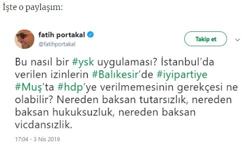 Portakal, “Bu nasıl bir #ysk uygulaması? İstanbul’da verilen izinlerin #Balıkesir’de #iyipartiye #Muş’ta #hdp’ye verilmemesinin gerekçesi ne olabilir? Nereden baksan tutarsızlık, nereden baksan hukuksuzluk, nereden baksan vicdansızlik.” diye yazdı.
