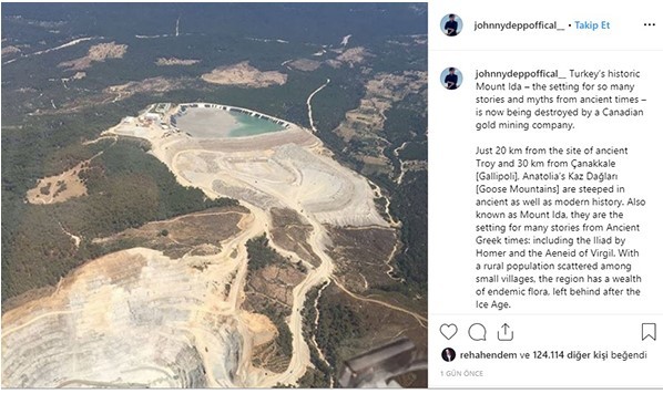 Karayip Korsanları filminin Kaptan Jack Sparrow’u dünyaca ünlü film yıldızı Johnny Depp sosyal medya hesabından Kaz Dağlarındaki maden arama faaliyetleri yüzünden meydana gelen doğa katliamını takipçileriyle paylaştı. Çevreye olan duyarlılığını kanıtlayan ünlü Hollywood yıldızı, birçok takipçisinden destek aldı.
