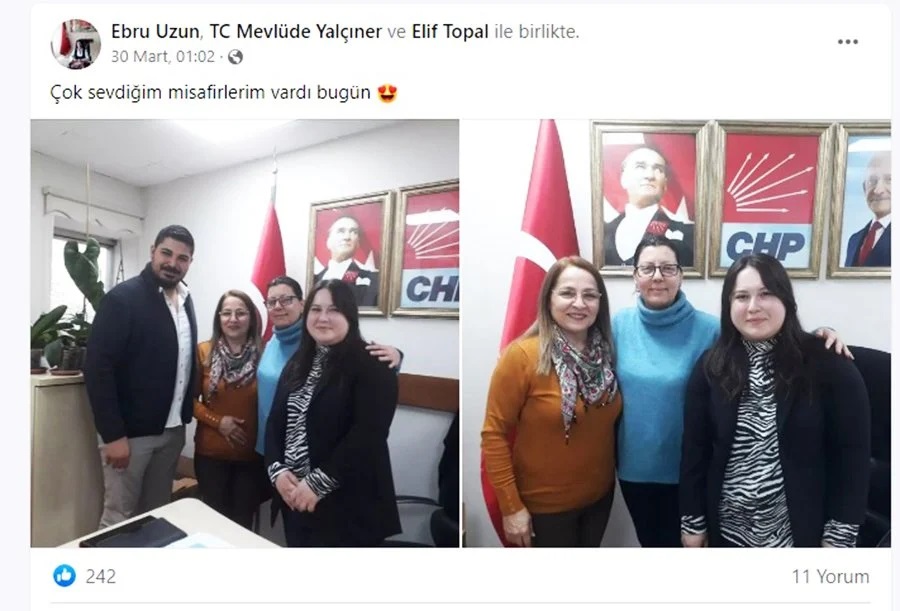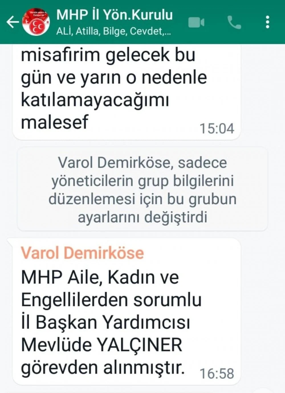 Mevlüde Yalçıner’in kendisini ziyaret etmesi nedeniyle görevinden alınmasına tepki gösteren CHP Merkez İlçe Başkanı Ebru Uzun, “MHP İl Başkanı Varol Demirköse’nin, yönetim kurulunda Kadın ve Engelli Politikalarından sorumlu İl Başkan Yardımcılığı görevini yürüten sayın Mevlüde Yalçıner’i şahsıma yapmış olduğu nezaket ziyareti sebebiyle görevden almış olduğunu üzülerek öğrendim.
