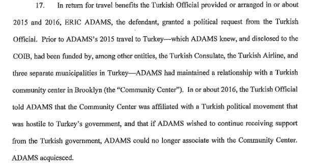 Savcılar, Eric Adams’ın 2016’dan bu yana Türk menfaat sahiplerinden 120 bin dolardan fazla seyahat yardımı aldığını ve bunu yasaların gerektirdiği şekilde açıklamadığını söylüyor. Savcılar, Adams’ın bu yardımların karşılığını Brooklyn ilçe başkanı, seçilmiş belediye başkanı ve belediye başkanı olarak yaptığı resmi icraatlarla ödediğini söylüyor.