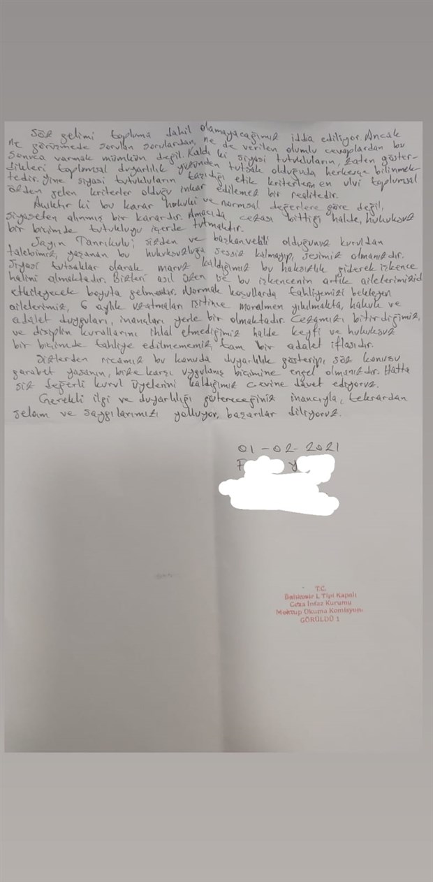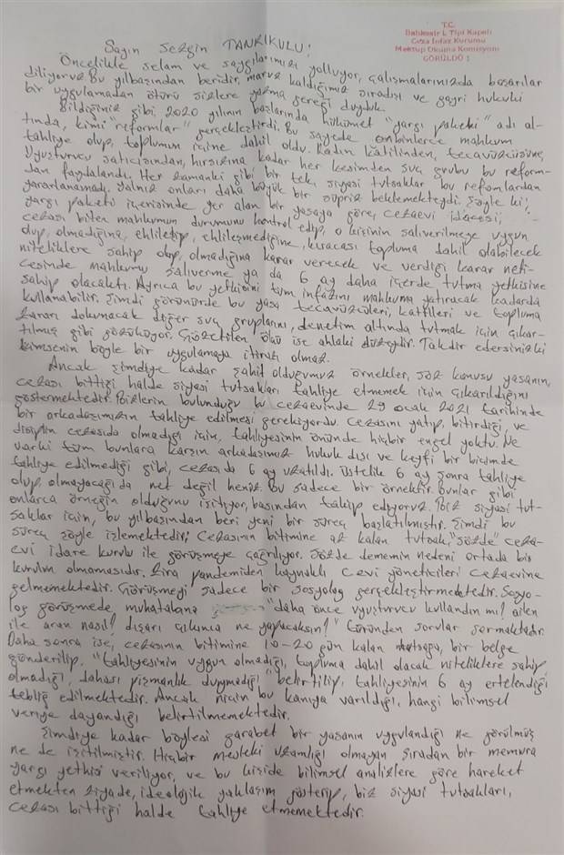 Balıkesir L Tipi Ceza İnfaz Kurumu’nda kalan F.Y. ise CHP İstanbul Milletvekili Sezgin Tanrıkulu’na yazdığı mektupta, bu düzenlemedeki yetkinin cezaevi yönetimleri tarafından keyfi kullanıldığını belirtti.
