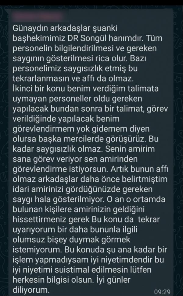 Sağlık emekçilerine gönderilen mesajda şu ifadelere yer verildi: “Şu anki başhekiminiz Dr. Songül Hanım’dır. Tüm personelin bilgilendirilmesi ve gereken saygının gösterilmesi rica olunur. Bazı personelimiz saygısızlık etmiş. Bu tekrarlanmasın ve affı da olmaz. O an o ortamda bulunan kişilere amirinizin geldiğini hissettirmeniz gerek. Bir daha bununla ilgili olumsuz bir şey duymak istemiyorum. Bu konuda tekrar uyarıyorum. Şu ana kadar bir işlem yapmadıysam iyi niyetimdendir.”