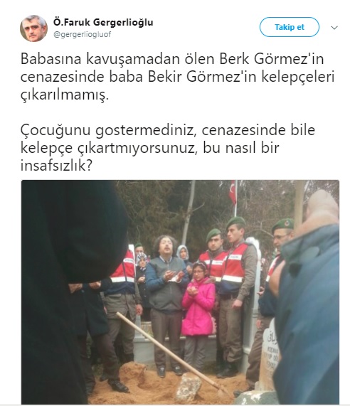 Bu duruma tepki gösteren eski Mazlum-Der Başkanı Ömer Faruk Gergerlioğlu, “Babasına kavuşamadan ölen Berk Görmez’in cenazesinde baba Bekir Görmez’in kelepçeleri çıkarılmamış. Çocuğunu gostermediniz, cenazesinde bile kelepçe çıkartmıyorsunuz, bu nasıl bir insafsızlık?” dedi.