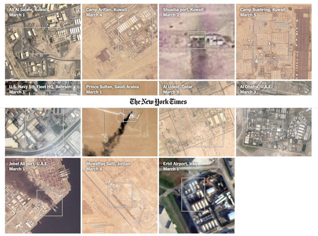 The New York Times, ABD'nin Orta Doğu'da aldığı ağır hasarın uydu haritasını yayımladı. Askeri raporlara dayanan analize göre; İran füzeleri ve İHA'ları bölgedeki en az 17 ABD askeri üssünü, büyükelçiliğini ve hava savunma tesisini vurarak ağır hasar verdi.