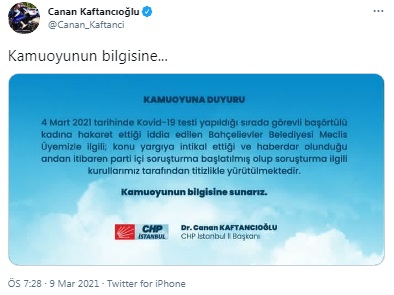 CHP İstanbul İl Başkanı Canan Kaftancıoğlu, “4 Mart 2021 tarihinde Covid-19 testi yapıldığı sırada görevli başörtülü kadına hakaret ettiği iddia edilen Bahçelievler Belediyesi Meclis Üyemizle ilgili parti içi soruşturma başlatıldı” açıklaması yaptı.