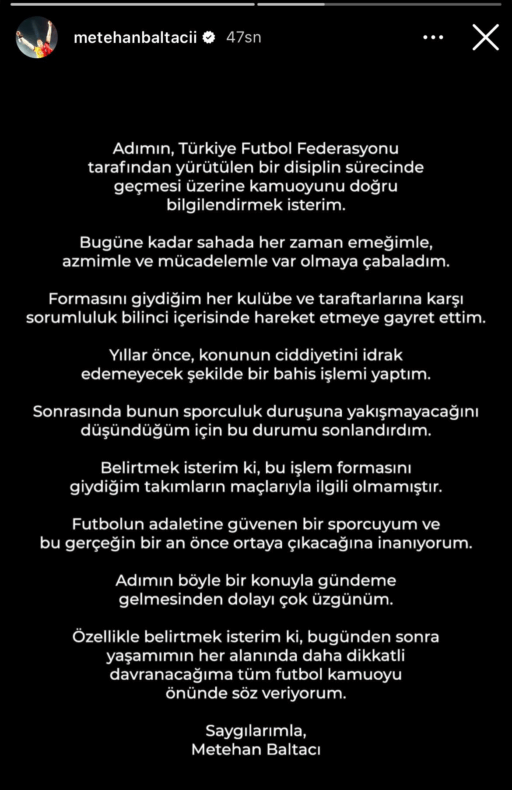 Bahis oynadığı gerekçesiyle PFDK’ye sevk edilen Metehan Baltacı’nın açıklamasında şu ifadeler yer aldı: