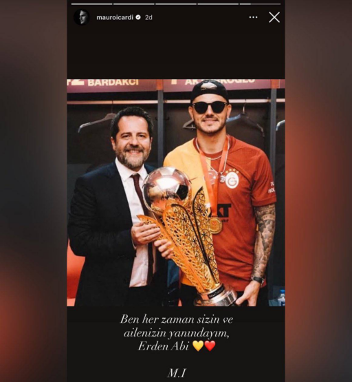 Galatasaray’ın Arjantinli süperstarı Mauro Icardi, sosyal medya hesabından yaptığı paylaşımda, eski Galatasaray Başkanvekili Erden Timur ile olan fotoğrafını paylaşarak, “Ben her zaman sizin ve ailenizin yanındayım, Erden abi” ifadelerini kullandı.